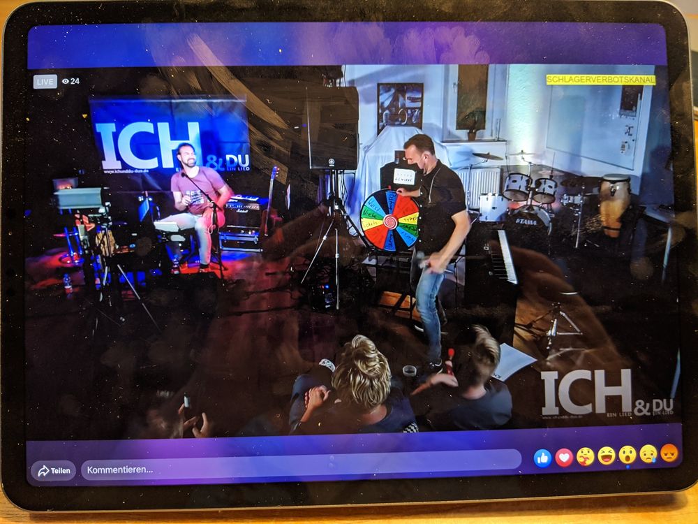 Was die Vielfalt der Interaktionsmöglichkeiten beim Wunschkonzert angeht, so war ich regelrecht baff, auf wie vielen Kanälen Ich & Du ansprechbar waren. Da waren einmal die zahlreichen Facebook-Kommentare (Stand heute finde ich unter dem Live-Video insgesamt 111 bei über 1600 Aufrufen), mit denen sich viele Fans ins Studio meldeten. Und Fans haben Klaus und Christian wirklich eine Menge – im Sauerland, aber auch in ganz Deutschland. Den Kommentaren konnte man entnehmen, dass viele der Anwesenden keine Unbekannten waren, sondern zu einer großen Fanbase gehören, die den beiden immer wieder folgen. Auch im Netz. Gleichzeitig zu Facebook wurde auch auf Instagram gestreamt – das allerdings nicht mit vergleichbarem Erfolg. Und dann konnte man E-Mails senden, Nachrichten auf WhatsApp schreiben oder anrufen. Insgesamt konnte man aber auch bei aller Vielfalt der Kanäle merken, dass der Fokus der Veranstaltung schon auf den Facebook-Interaktionen gelegen hat. Das ist ja auch völlig verständlich und ich würde das im Leben nicht hinbekommen, auf so viele andere Kanäle zu blicken und gleichzeitig noch aufzutreten. Angerufen haben auch noch einige Fans. Da hätten es bestimmt nach dem Geschmack von Ich & Du ein paar mehr sein dürfen, mit denen man dann Spökes vor laufender Kamera getrieben hätte. Insgesamt muss ich aber sagen: großen Respekt, wie viel Interaktion am Ende zustande kam.