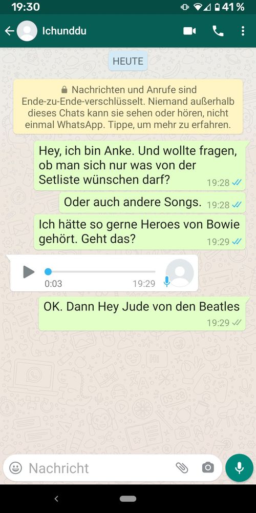 Allen, die Spaß an richtig guter Musik unplugged haben, gerne mal ein bisschen Quatsch mit zwei Musikern am anderen Ende des Computer-Interfaces machen möchten oder die sogar Lust haben, bei der nächsten Aufführung in Lüdenscheid (am Samstag, 19. September, wieder 19.29 Uhr) dabei zu sein, kann ich das Wunschkonzert von Ich & Du sehr empfehlen. Und schaut vorher in die Setlist!!